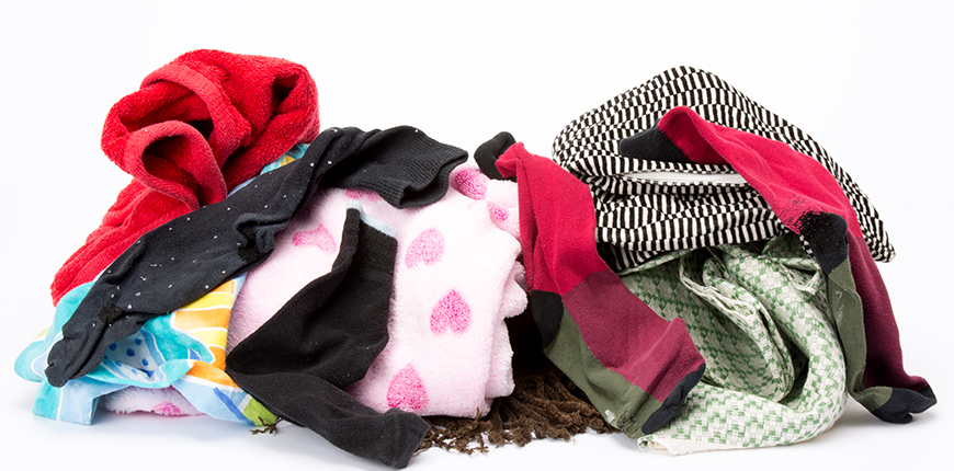 - Strumpor, underkläder och mycket smutsiga eller trasiga kläder – släng i soppåsen hemma eller i container för energiåtervinning.